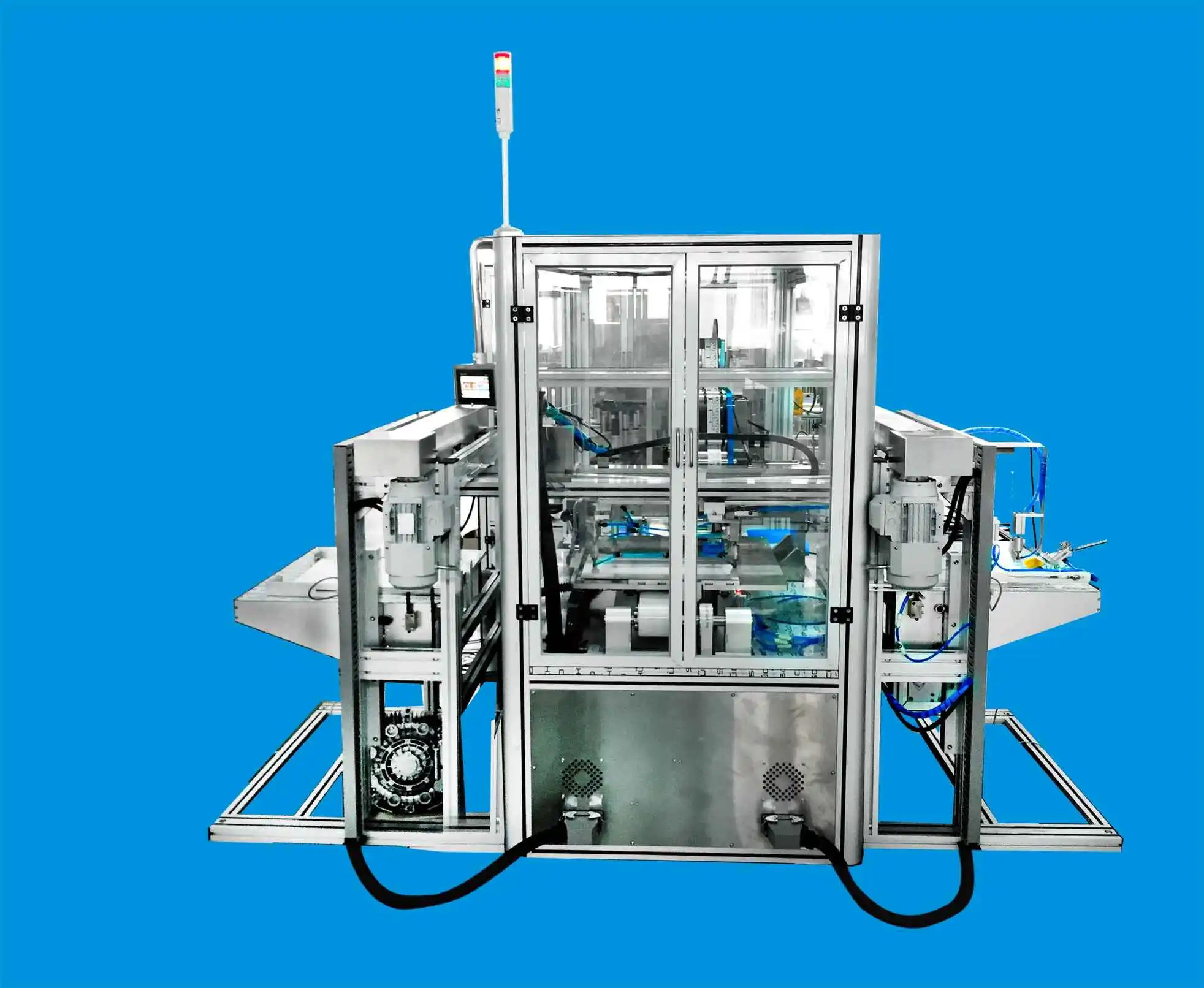 -After the labeling is completed, the feeding suction cup (with vacuum suction) lifts the entire sheet of card paper and sends it to the feeding conveyor belt. The conveyor belt then transports the card paper into the receiving lifting platform on the left. The receiving lifting platform automatically adjusts its height according to the height of the incoming card paper.
